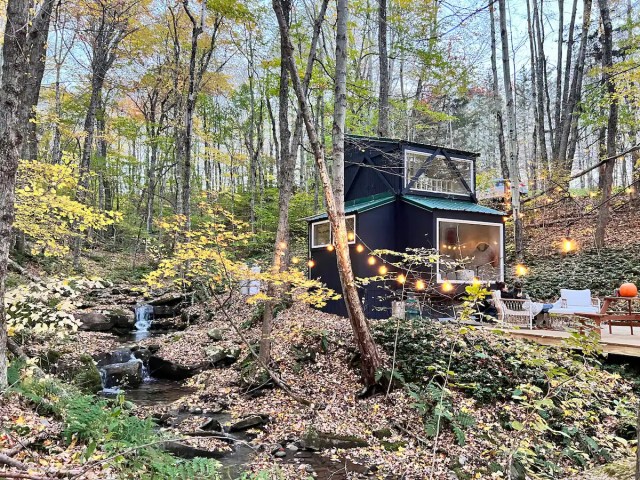 This Tolkien-inspired stone cottage has 1 bedroom, 1 bed, and 1 bath, a wooden barrel hot tub, glass mosaic fireplace, bednook, and is surrounded by 27 acres of serene woods.