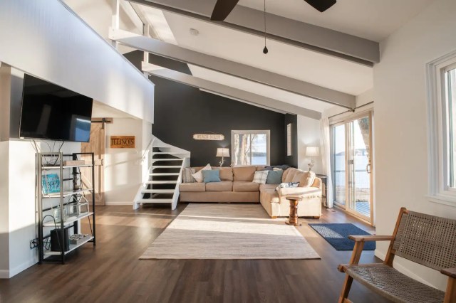 The idea of a wraparound deck, stunning panoramic views, and open-concept design really sounds like a majorly relaxing weekend to us!