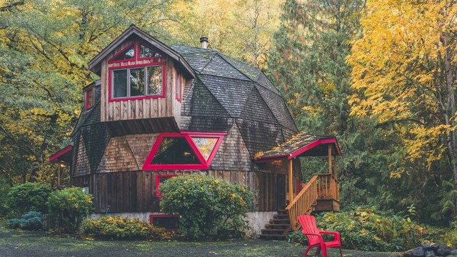 Only an hours drive away from Portland, Welches is home to this unique mountain hideaway. The giant domed building has three bedrooms, two and a half bathrooms and is suitable for a group with up to nine members. Located on seven private acres, your family can enjoy quick access to two seasonal creeks and the Mt. Hood National Forest. Just outside the front door a trail leads to a nearby waterfall, where you can watch the local wildlife while you sip your morning coffee.