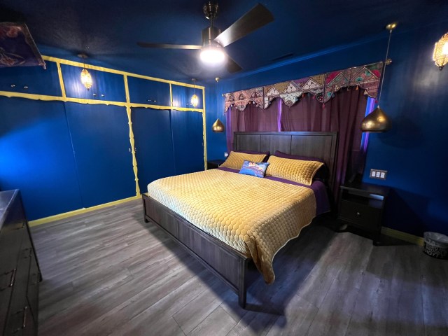 But first things first. Walking into the modest three-bedroom Anaheim-area home, your kids will first need to decide which of the three themed bedrooms they’ll want to claim as theirs. The Cinderella room has two bunk beds (one with a pull-out trundle) perfect for a brood of little princesses; the Aladdin room has a king-sized bed and a flying carpet suspended from the ceiling—plus loads of fun details like jewels over the doorways and hanging golden lanterns fit for Arabian nights; and the Beauty and the Beast room, which is far and away the coolest room in the house. Why? Because it’s MAGICAL. At least, your kids will think so.