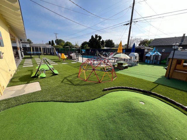 Of course, they will come out eventually. And when they do, lure them outside. This backyard has more toys and play features than a public playground, including a ping pong table, a corn hole game, a teeter-totter, two spring rockers, FIVE kiddie playhouses, a dome climber, a giant Connect Four game, a full swing set with a slide, a small mini golf course. Oh, and a pool (with all the rafts, kiddie floats, and pool toys you’d need for a proper pool day).