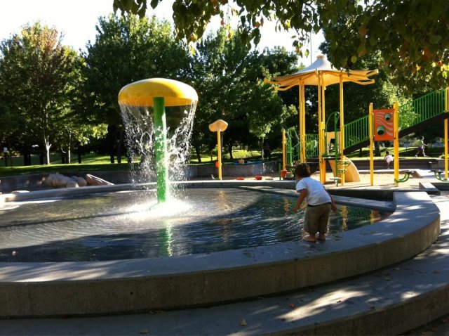 Two frog statues make this splash pad look like a real pond. As kids race about on a slip-free surface, water shoots gently up to about the same height as your little ones. The water comes out with minimal pressure so that your kiddo won’t be surprised as they frolic and play. The new, inclusive Magical Bridge playground is here, too, so be prepared to spend the day!