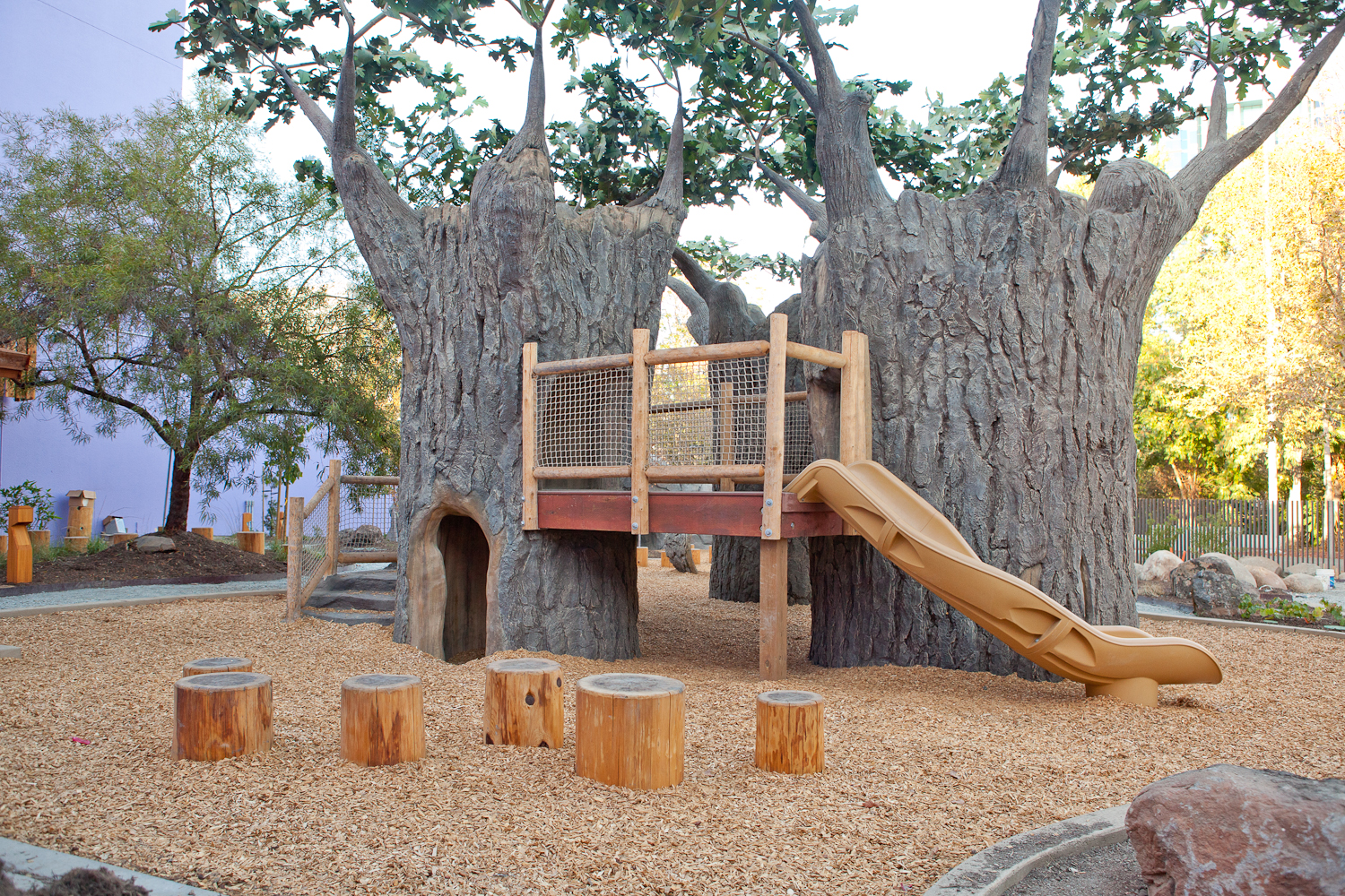 The lookout tower and tunnel provide an area for kids to change their perspective and slide down the concrete slides or roll down the hill. In the tree climber, little explorers can make their way across the rope bridge or hide in the caves in the base of the trees.