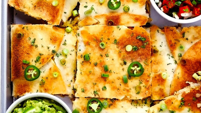 This recipe from Gimme Some Oven is sheet pan perfection. How else would you get the cheese the right amount of gooey? As a bonus, this recipe calls for pre-cooked chicken, so your prep work is simple.