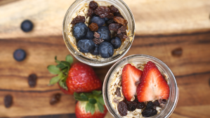 - Top with additional toppings of choice! We loosely use 1-2 Tbsp. of blueberries, strawberries, coconut chips, cacao nibs, bananas and walnuts per jar.
