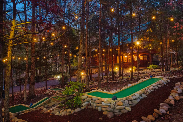 Your visit to the Great Smoky Mountains is going to be that much more epic when you stay at this upscale cabin that has everything you need and more. It comes with its own outdoor mini golf course, dual arcade-style driving simulators and the most epic fire pit you've seen. Located in a gated community, there are no scary winding roads to get you there.