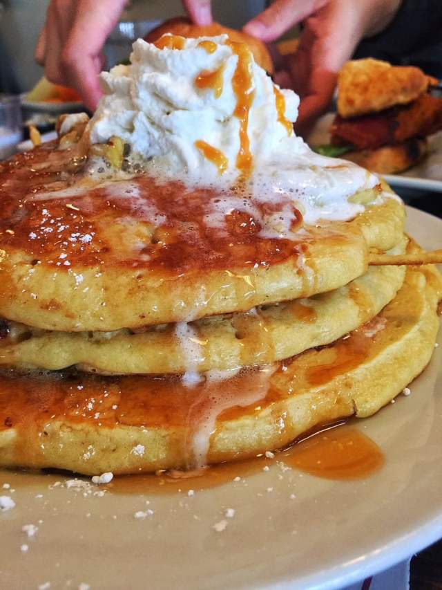 Cost: caramel apple pancakes, $12; French toast, $12; kid's breakfast, $4.50