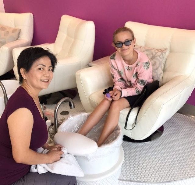 Pamper time! Have a little mommy (or daddy) and me togetherness. First off, love the adorable decor and attention to detail. Also, breathe freely (there's minimal chemical smell) and relax on the comfy couches. Even more, we appreciate the copper pedicure bowls which keeps things clean. Finally, embrace the neck pillow and complimentary beverages with each treatment. Call ahead, they get busy!