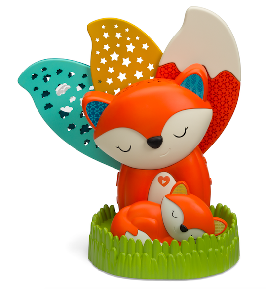 This sweet fox nightlight, the Infantino Go Gaga Musical Soother & Night Light Projector, plays soothing melodies or nature sounds for 20 minutes to help baby fall asleep and tune out other noises. You can also add a light show that displays slowly drifting colorful stars and clouds on the wall. Choose one or both, depending on what your child enjoys. For added comfort, the baby fox nightlight can be removed and placed in bed.