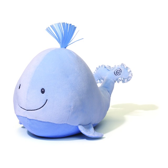 The Sleepy Seas Sound & Lights Whale from GUND is a cute, cuddly creature with special powers: Press the music symbol for 20 minutes of soothing sounds, followed by an automatic shutoff. Pressing the spiral symbol lets you choose one of these soothing sounds: whale sounds, ocean, bubbles, white noise with waves, and Brahms' "Lullaby." Change the volume with a press of the tail. While the calming sounds soothe your baby for rest, circles of light will glow from this smily whale's cheeks.