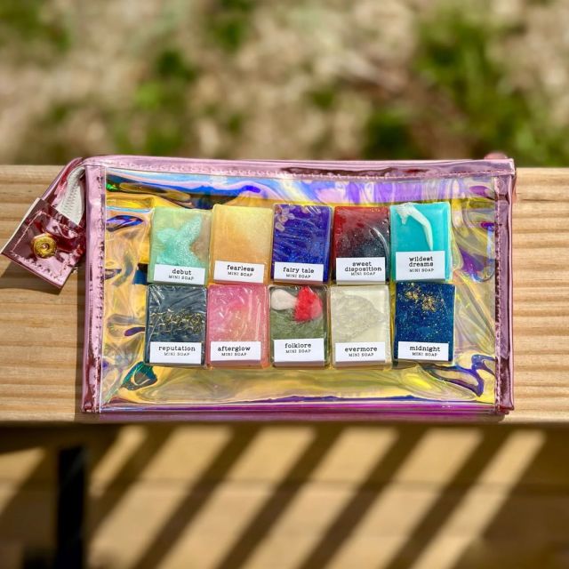 Featuring 11 Swiftie-inspired mini-soaps like Folklore, Reputation, and Wildest Dreams, this pack comes in a cute reusable iridescent pouch.