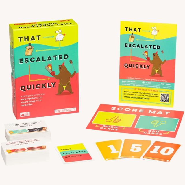 From the folks that launched the viral Exploding Kittens game, That Escalated Quickly is the family game for ages 10+ where you work together to answer a question in the right order from 1 - 10 while the asker tries to figure out what order each answer goes in.