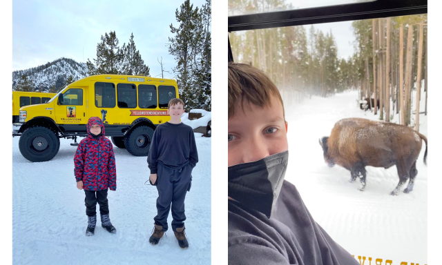 6. Yellowstone is just a short drive away. Do yourself a favor and put a winter visit to Yellowstone on your list. The park is closed to everyone except those arriving via snowcoach or snowmobile so you'll get a totally unique view of this majestic national park. During our visit we had a cab take us to West Yellowstone where we met up with our snowcoach tour. This bus with oversize snow tires took us to view all of the hot spots including Old Faithful, Biscuit Basin and lots of stops for bison and bald eagle spotting. Lunch was included and the kids absolutely loved it! The parents loved that they didn't have to plan anything and could just sit back and enjoy the day.