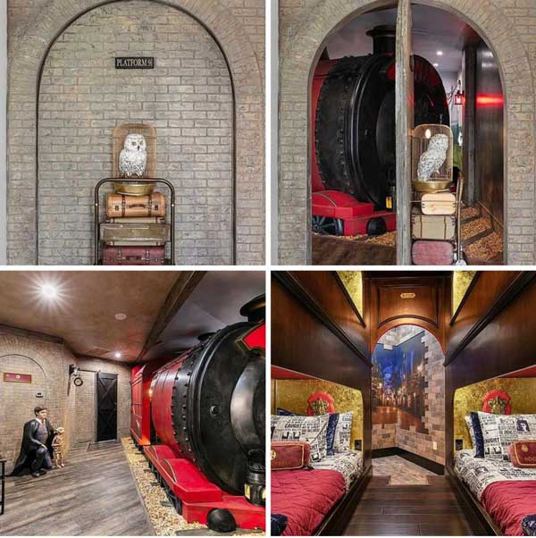 While the rest of the house seems like a relatively traditional pad, the Harry Potter theme takes flight when you reach a wall that resembles the 9¾ platform. If that doesn’t alert you to the possibility of things getting wacky, the locomotive—where you’ll find sleeping quarters—the nook inhabited by a dragon, the Whomping Willow, Hagrid’s pet spider, even a thematic bathroom will.