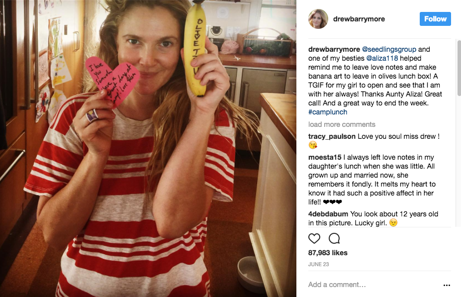 Drew Barrymore may be a mega-star, but to her kids, Olive and Frankie, she’s just Mom. And this mom-ness is more apparent than ever in Drew’s recent Instagram posts, where the actress shares the contents of the adorable lunches she packs for Olive to take with her to camp.