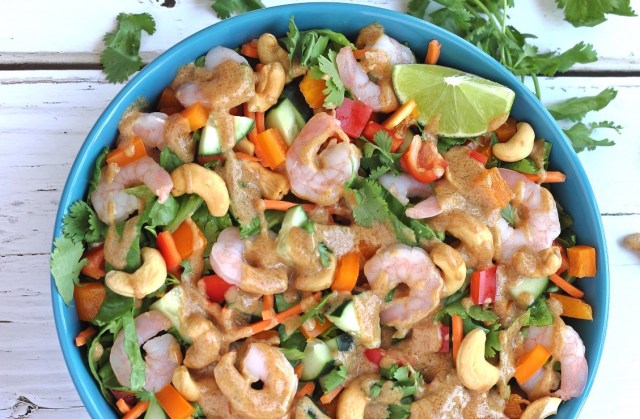 Cashews, cilantro, cucumber and carrots come together with cocktail shrimps to make this a lunch that can be put together without any cooking. The dressing has an almond butter base making it creamy and delicious while still being dairy free. Get this keeper of a recipe at Physical Kitchness.